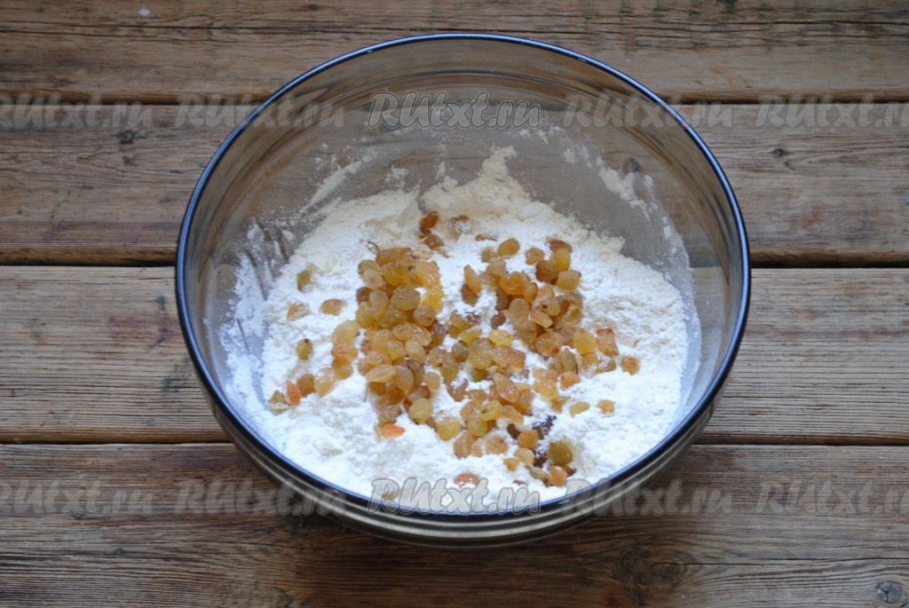 Всыпать изюм, перемешать сухие ингредиенты.