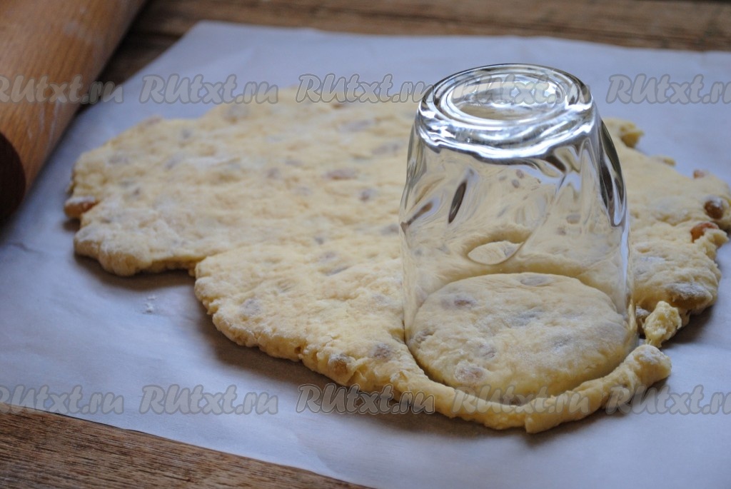 С помощью стакана вырезать круглые заготовки. Из данного количества ингредиентов у меня получилось 9 сконов.
