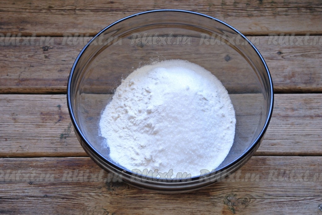 В подходящую миску просеять муку, всыпать соль, сахар и разрыхлитель, хорошо перемешать.