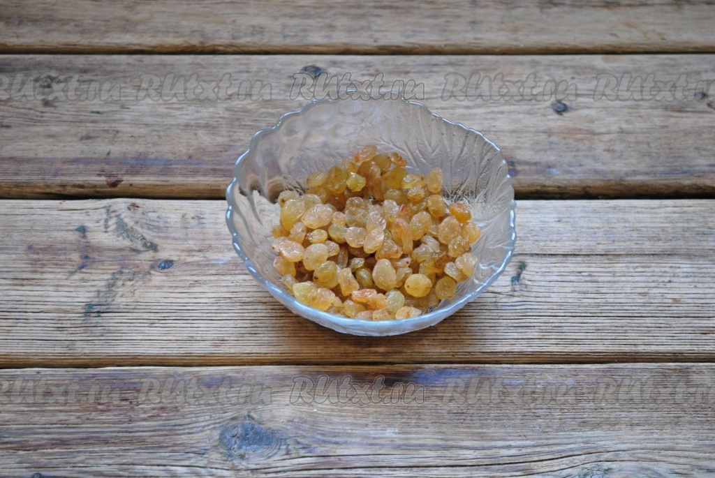Изюм вымыть и выложить на бумажное полотенце, чтобы он обсох. Если изюм очень сухой - его нужно залить кипятком на 10-15 минут, затем воду слить, а изюм обсушить.