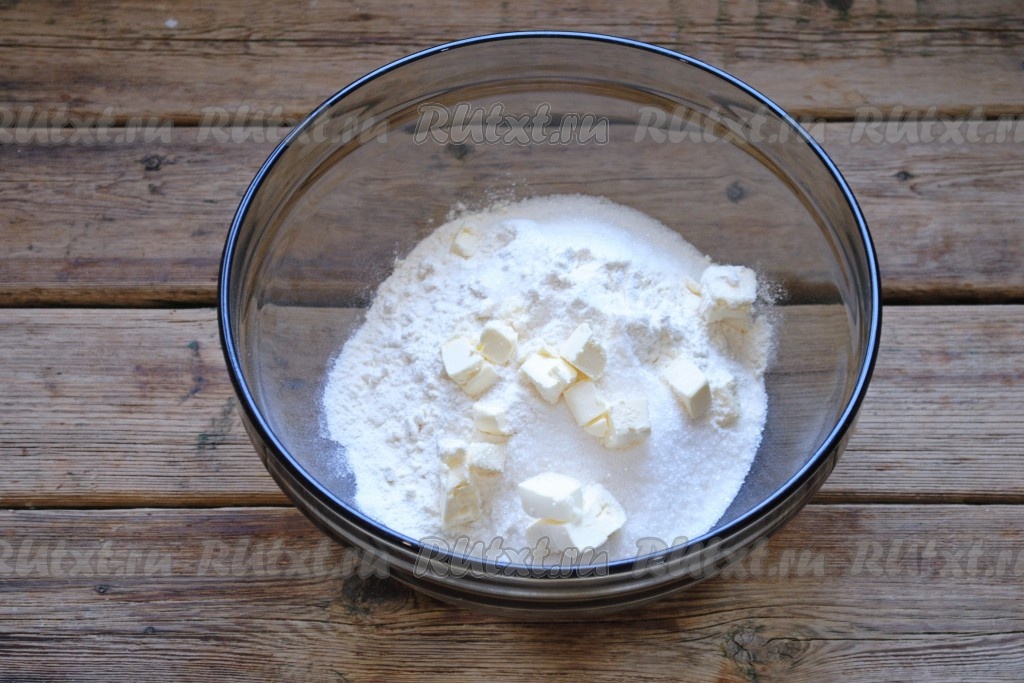 Добавить охлаждённое сливочное масло, натёртое на тёрке или нарезанное небольшими кубиками. Руками перетереть получившуюся массу в крошку.