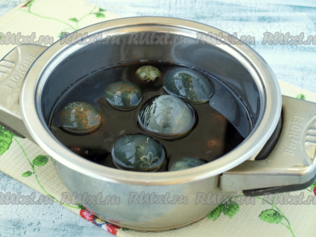 Чай каркаде процедить, добавить в него уксус и поместить туда яйца.