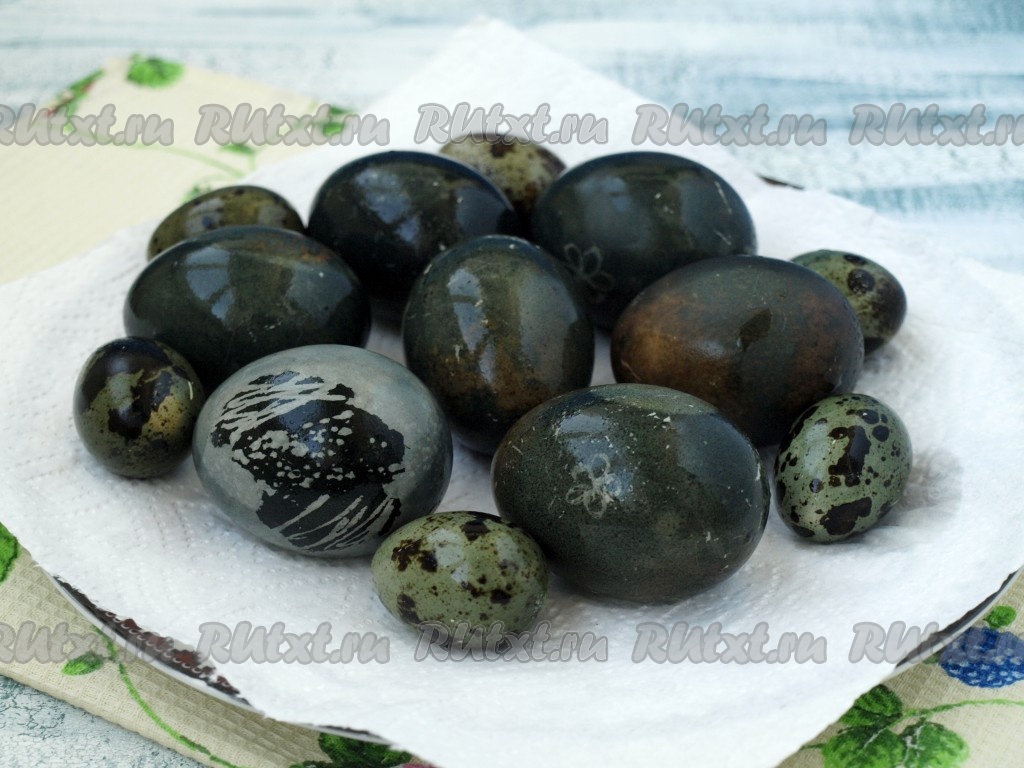 На яйцах могут появиться точки и полоски, здесь уже как повезёт. Вынуть яйца, выложить на салфетку и обсушить. Затем смазать яйца для блеска растительным маслом.