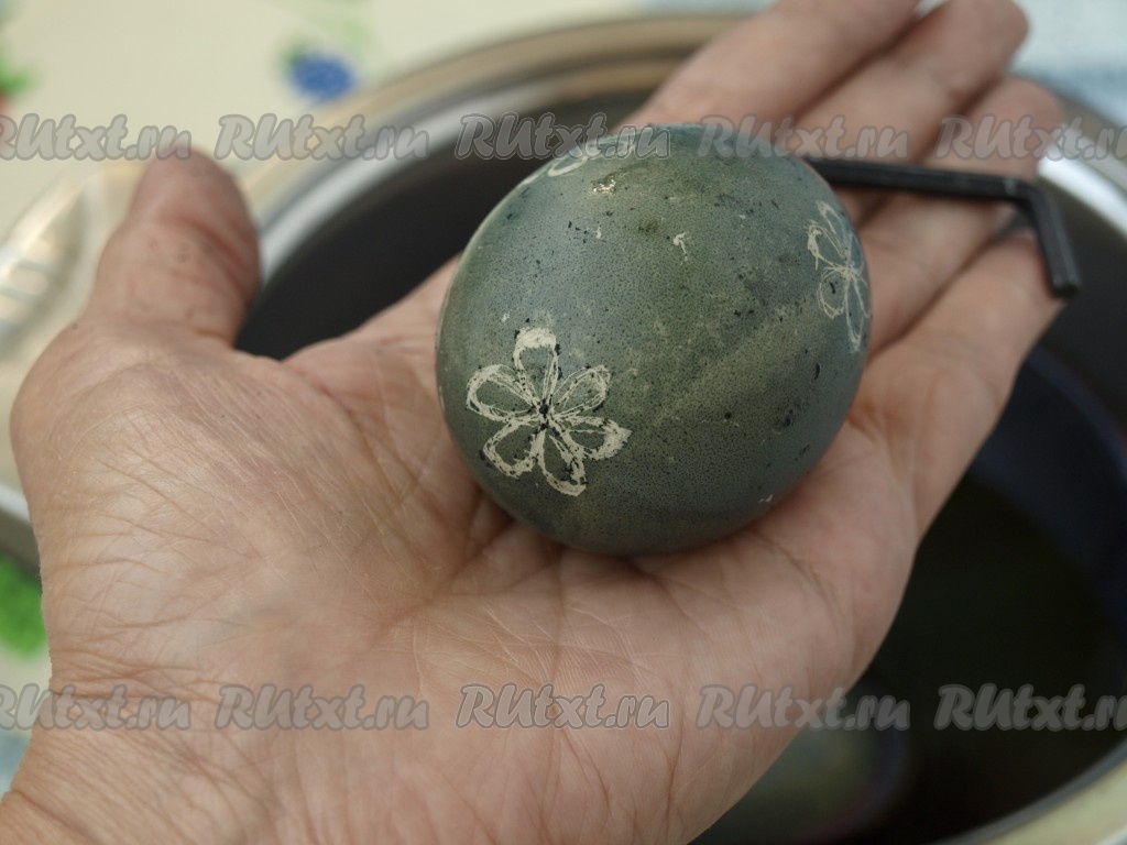 Как вариант, острым предметом аккуратно можно нацарапать на окрашенной скорлупе рисунок и снова опустить яйцо в раствор.