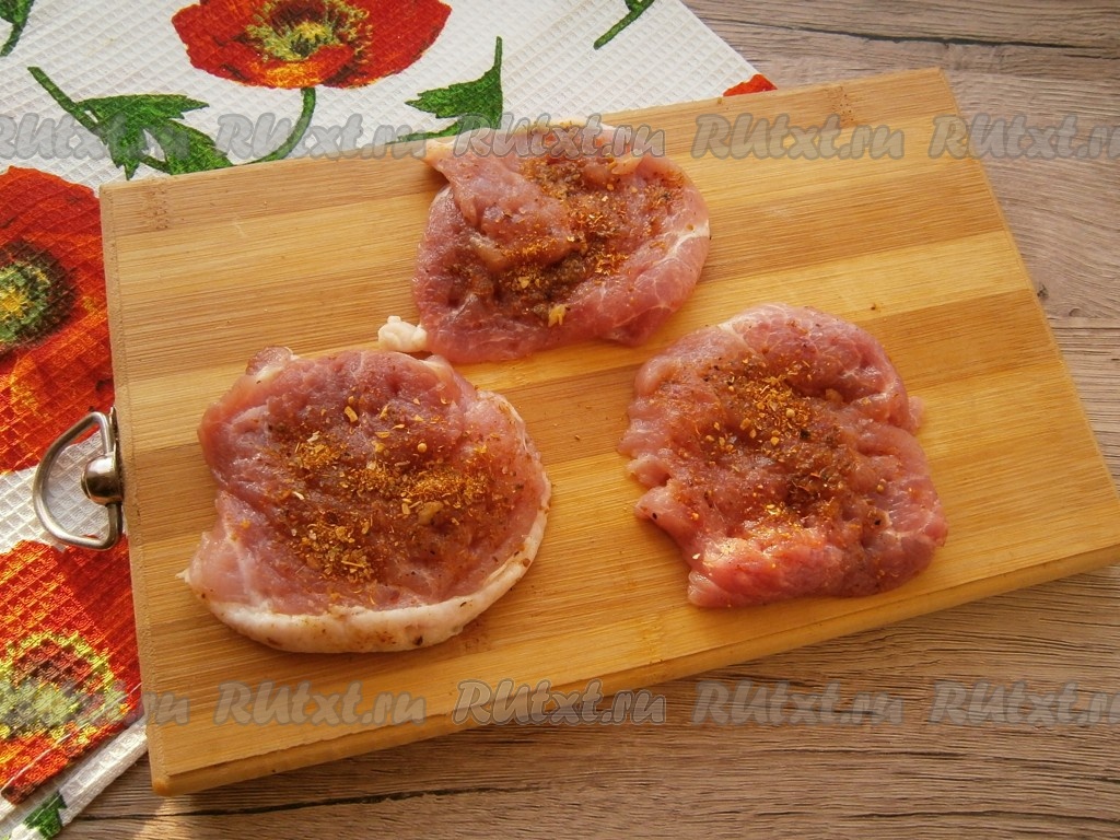 Свиную вырезку разрезать на 3 куска толщиной около 1-1,5 см. Обрезать края, чтобы куски мяса стали как можно круглее. Отбить мясо немного молоточком, посолить его, посыпать специями.