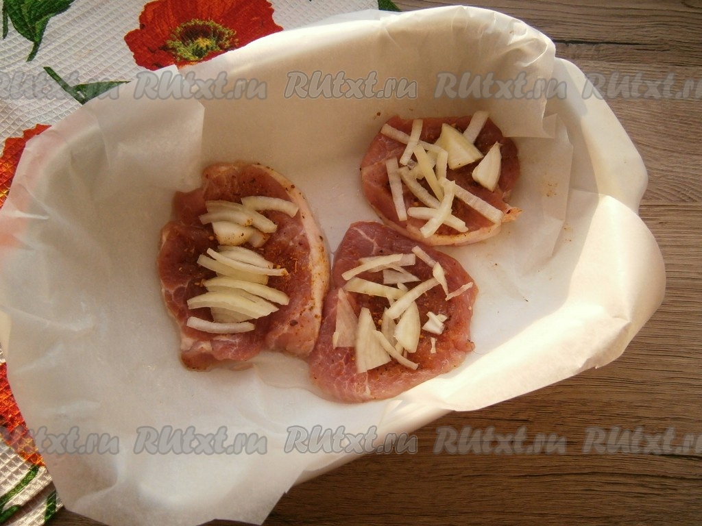 Поместить мясо в небольшую форму, застеленную пергаментом и смазанную растительным маслом. На мясо выложить нарезанный тонкими четвертинами очищенный репчатый лук.