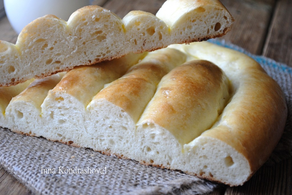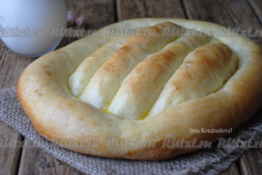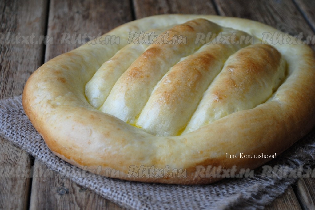 Затем пальцами сделать борозду по периметру (как на фото) и 2-3 параллельных бороздки. Края лепёшки немного прижать, чтобы были более плоскими.