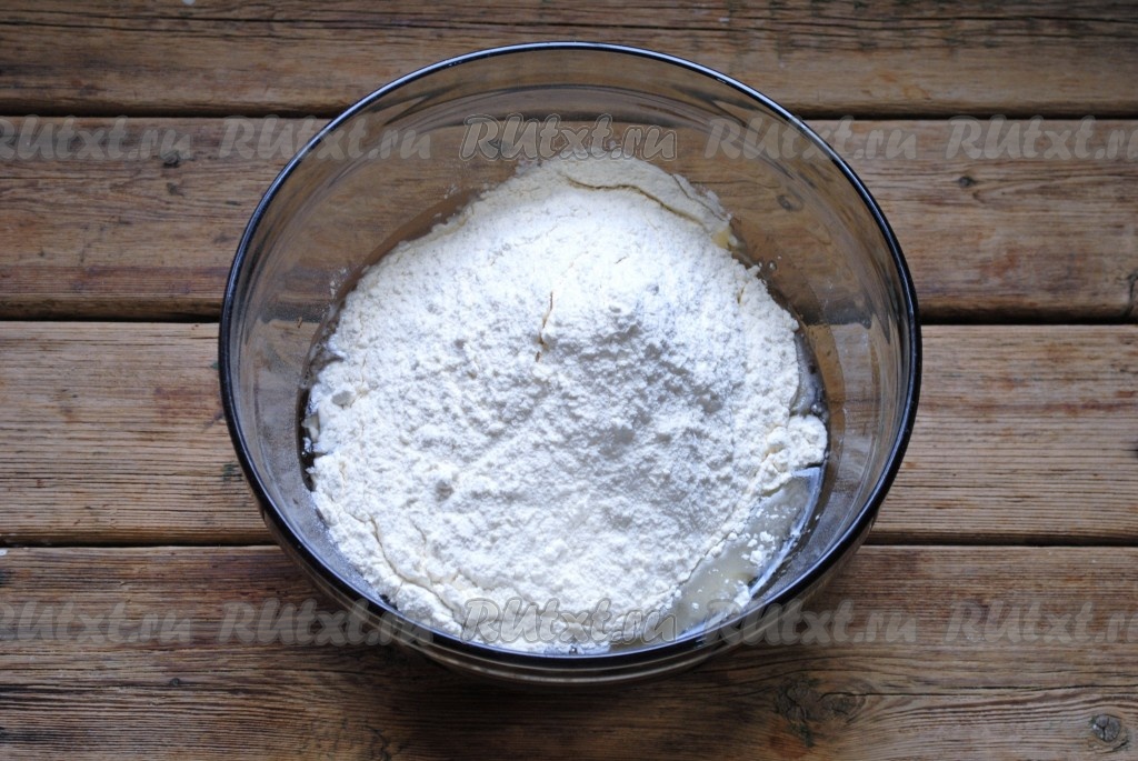 Затем влить растительное масло, добавить соль и просеянную муку.