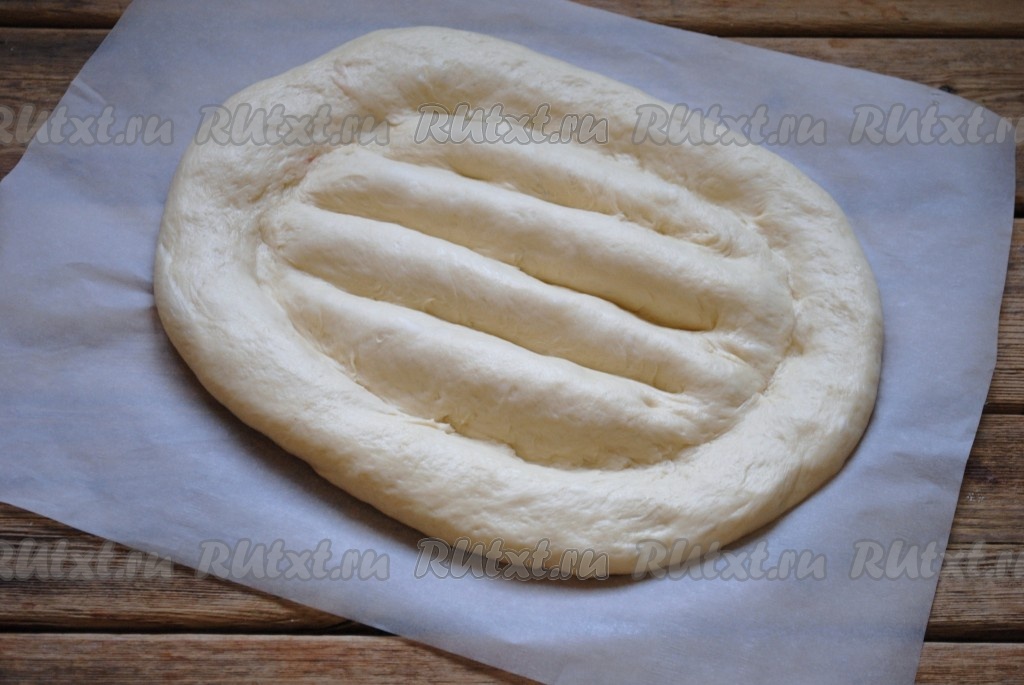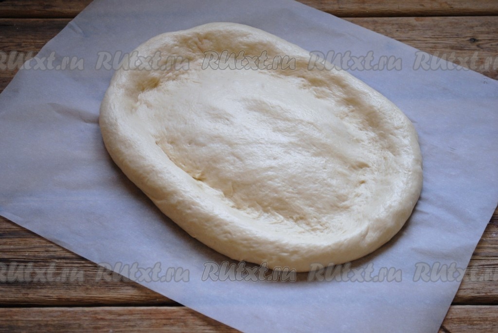 Противень застелить пергаментом и выложить тесто. Руками растянуть его в овальную лепёшку толщиной около 2 см.