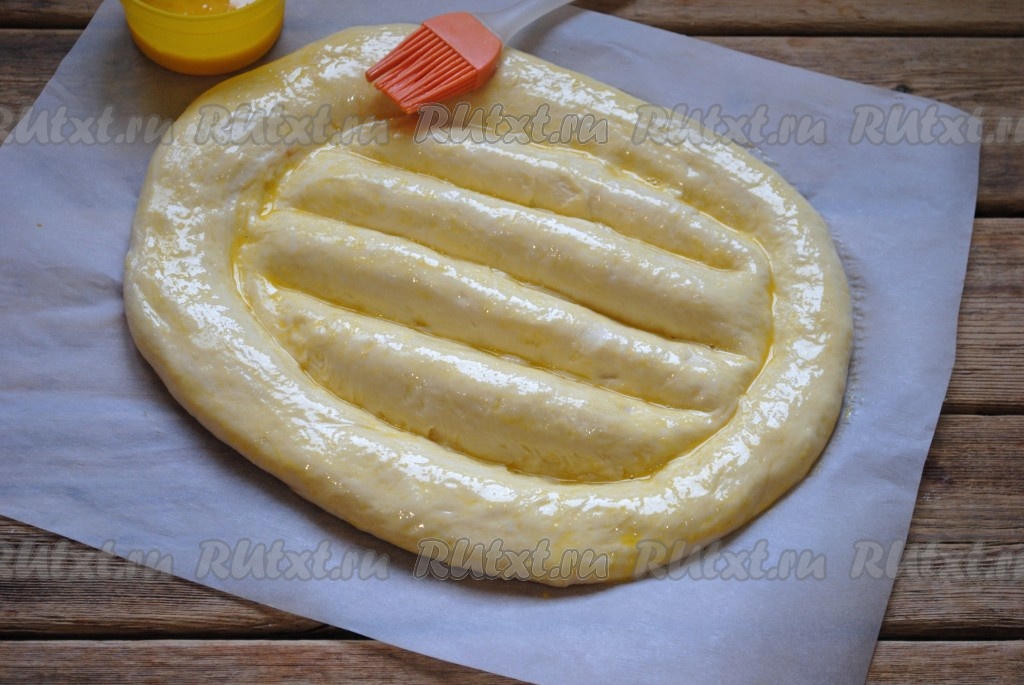Накрыть заготовку полотенцем и оставить на 10-15 минут. Затем смазать поверхность хлеба взбитым яйцом.