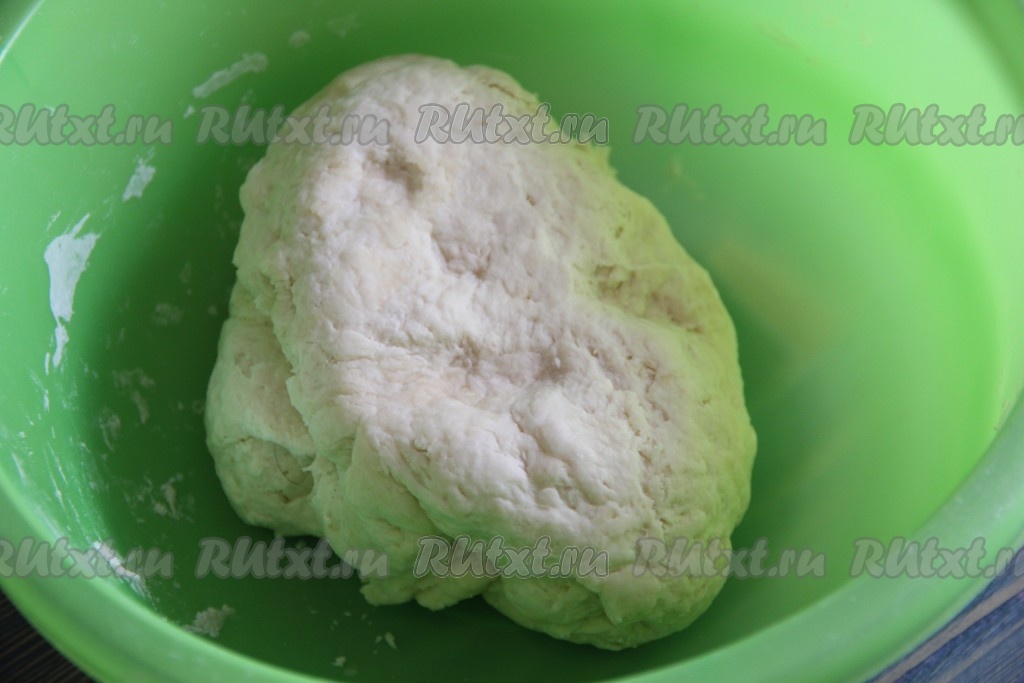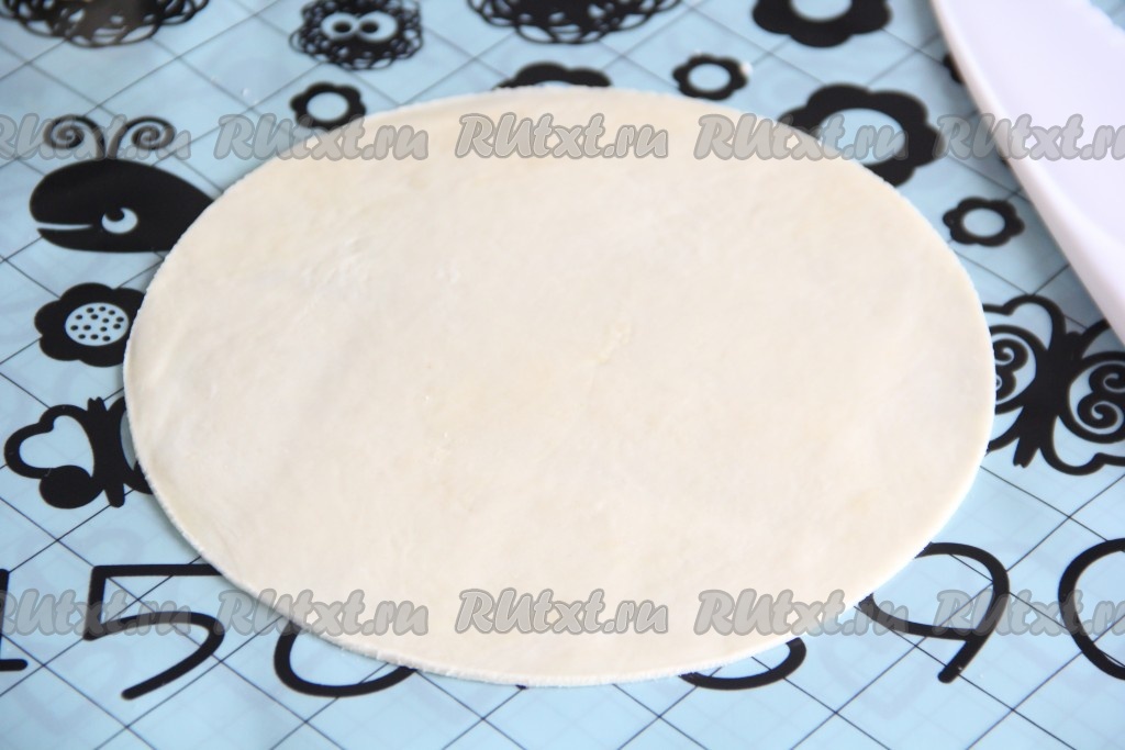 На столе, присыпанном мукой, или на силиконовом коврике раскатать тесто тонко скалкой и вырезать ровный круг.