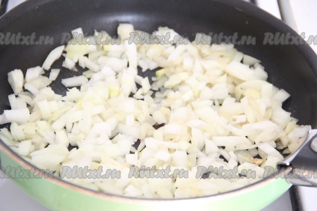 Лук очистить и мелко нарезать. На сковороду налить растительное масло, выложить лук и обжарить, помешивая, до золотистого цвета.