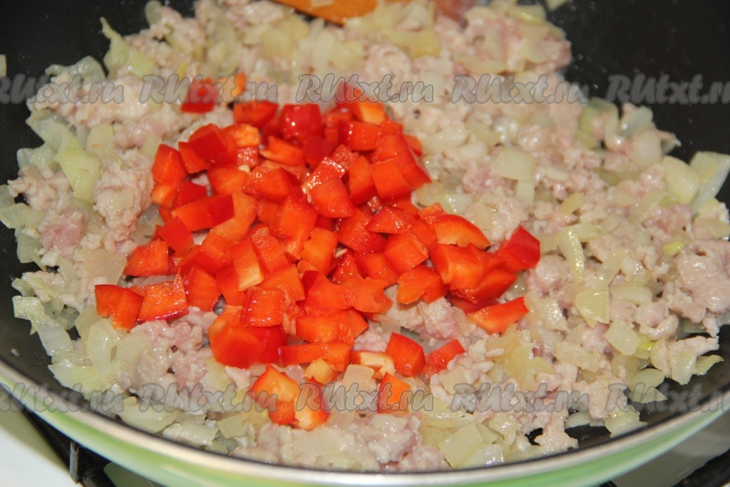 Перец вымыть, удалить плодоножку с семенами и нарезать на кубики среднего размера. Выложить перец к фаршу с луком и обжарить в течение 15 минут, помешивая.