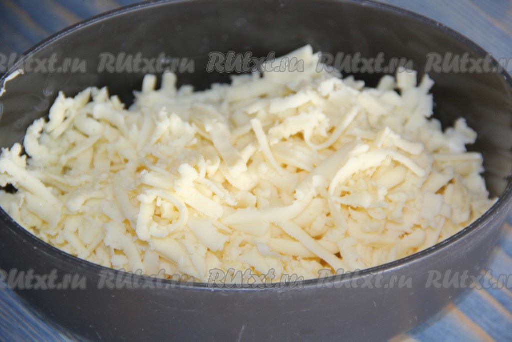 Поверх сыра выложить пару столовых ложек горячей начинки.