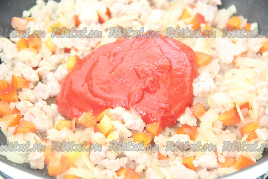 Затем добавить томатную пасту, соль и специи, перемешать.
