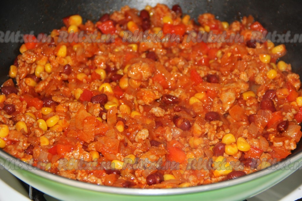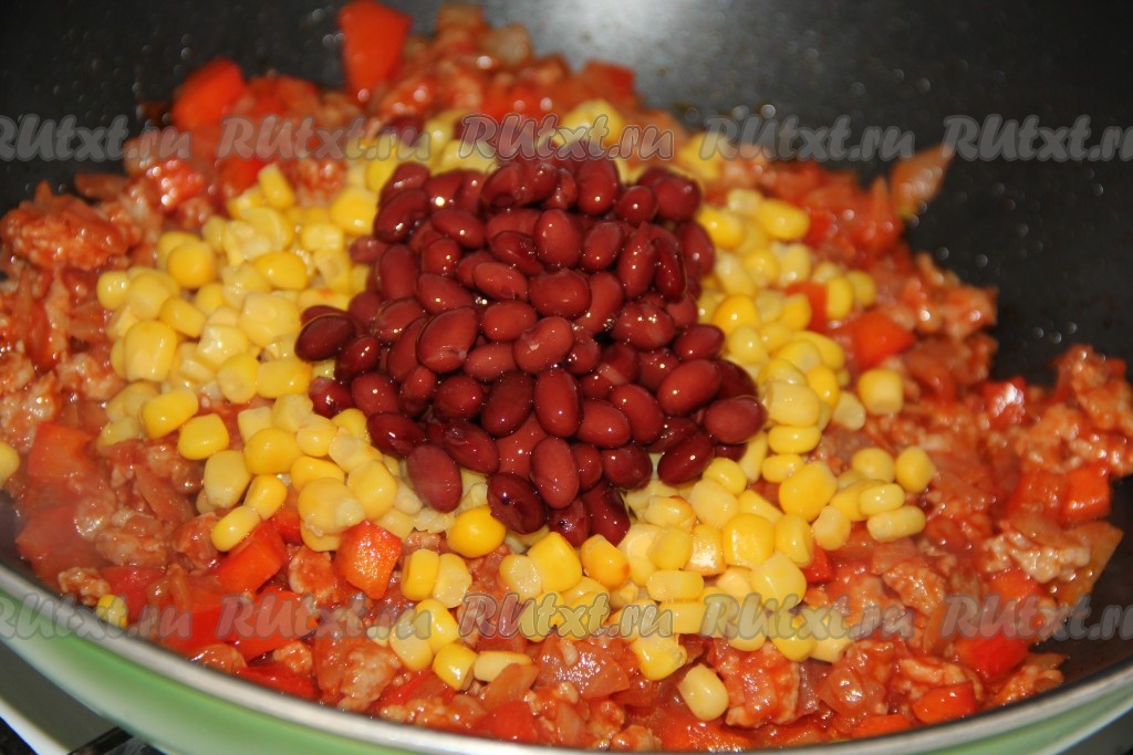 Тушить фарш с овощами в течение 5 минут, затем добавить кукурузу и фасоль. С кукурузы и фасоли предварительно слить жидкость.