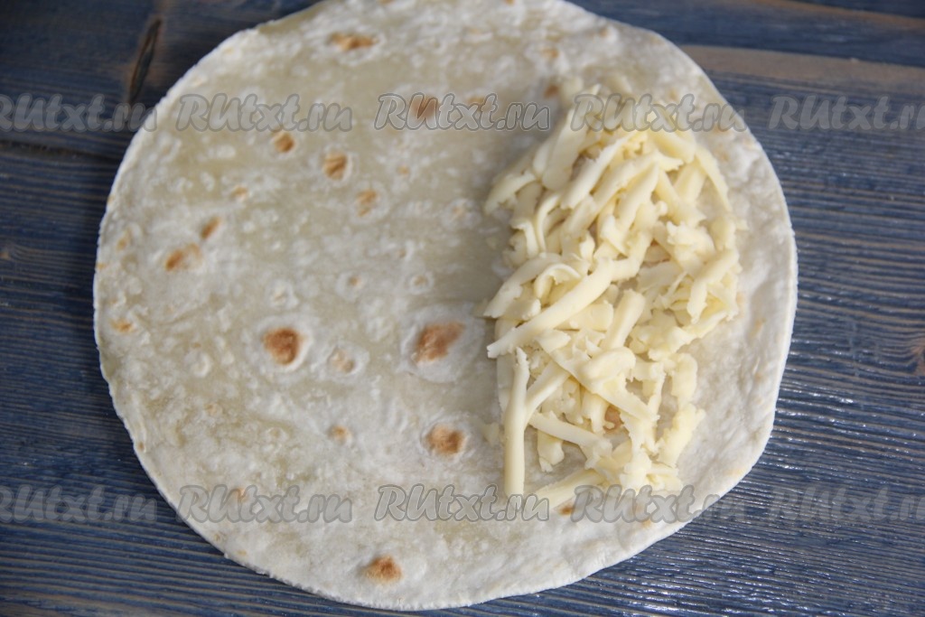 Сформировать кесадилью, для этого на край лепёшки выложить немного сыра.