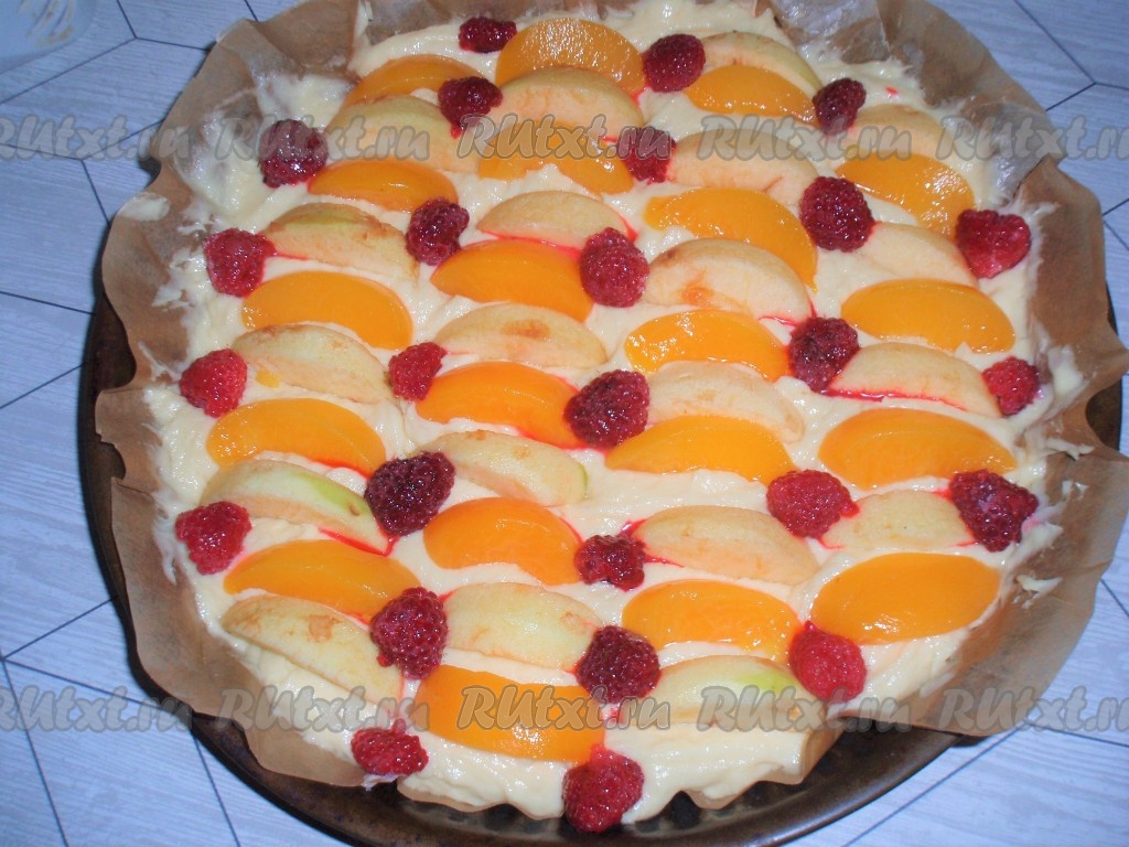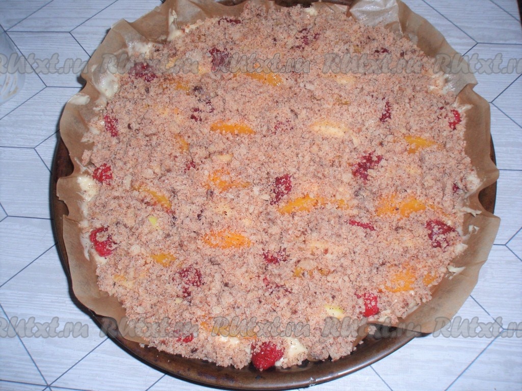 Штрейзелем посыпать тесто с фруктами и ягодами.