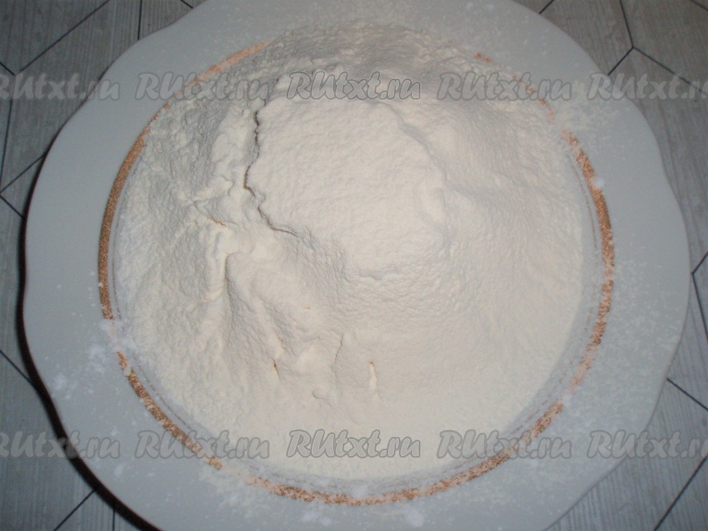 Просеять муку, крахмал и разрыхлитель.