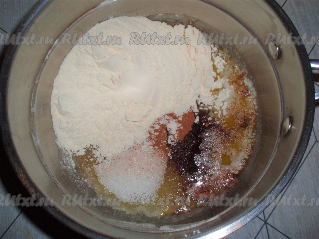 Для приготовления штрейзеля растопить сливочное масло, добавить к нему сахар, корицу и муку.