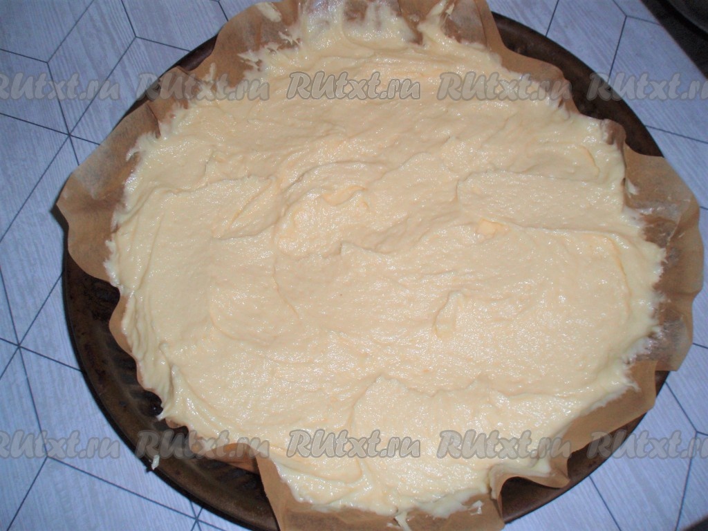 Тесто выложить в форму для выпечки. При необходимости смазать форму маслом, либо застелить бумагой для выпечки (если форма силиконовая, делать это необязательно).