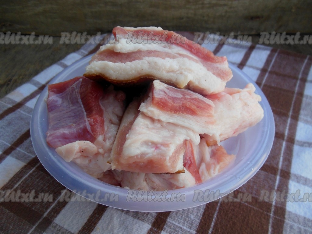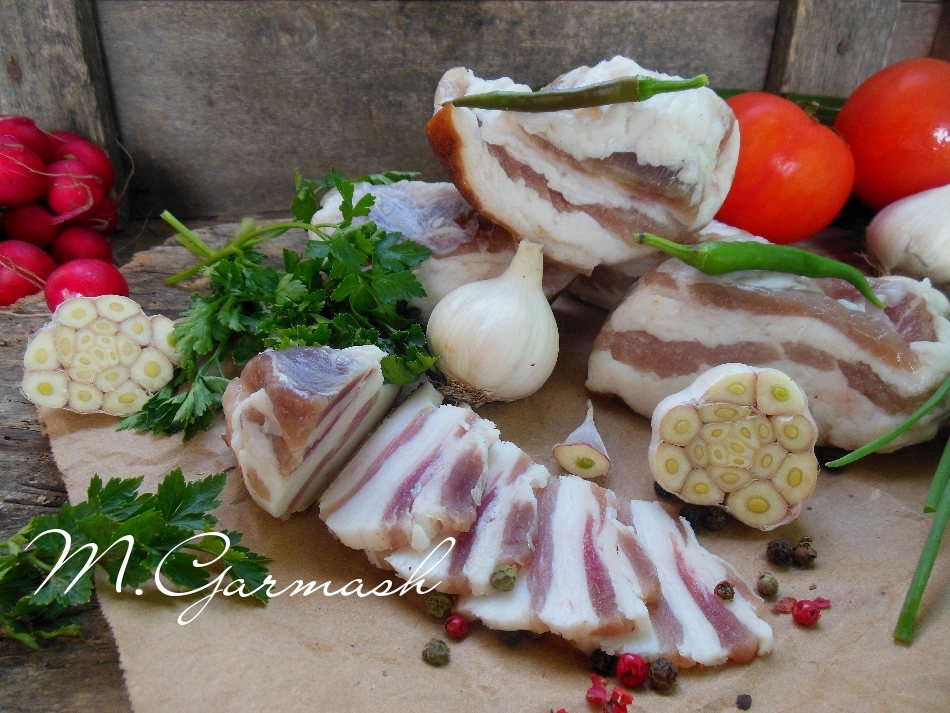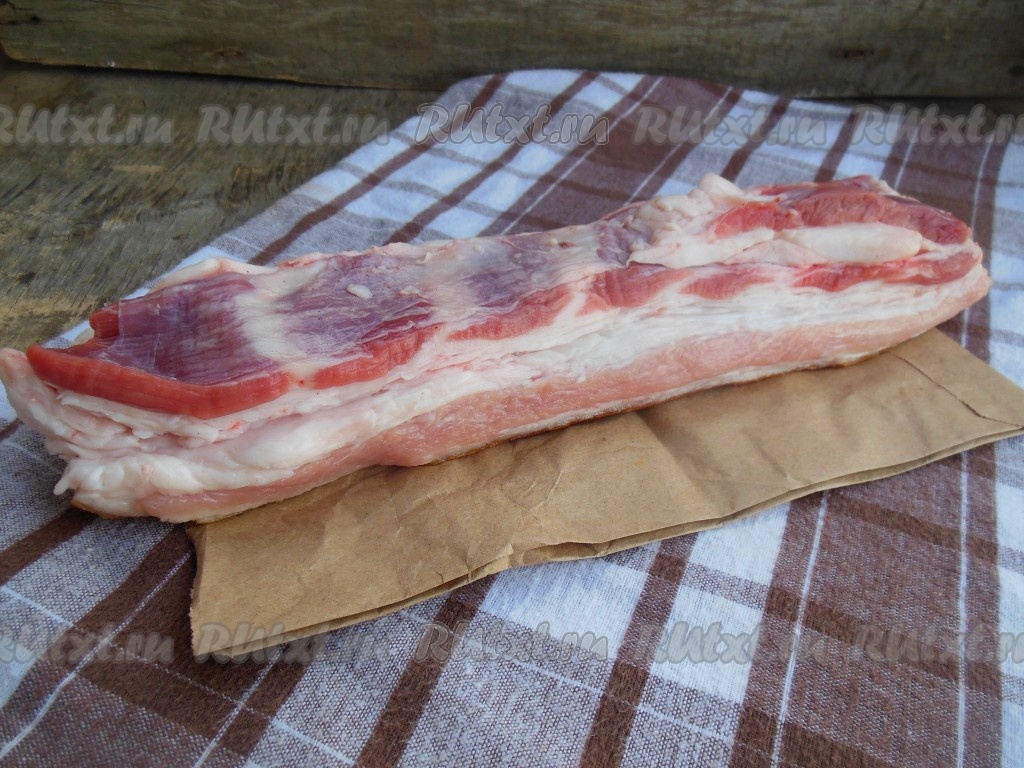 Я солю сало с мясной прослойкой, можно таким способом посолить и сало без прослоек. На рынке необходимо тщательно подойти к выбору хорошего кусочка сала для засолки. Если есть возможность, попросите продавца отрезать небольшой кусочек шкуры. Подпалите ее с помощью зажигалки (на это уйдёт пара секунд), а затем хорошо понюхайте. Таким образом вам откроется весь запах, легко будет обнаружить, как в народе говорят "кнурятину", - сало не кастрированного кабана. Мясо и сало у таких животных воняет даже при термической обработке. Также необходимо смотреть и на само сало - оно должно быть светлое, не липкое. Шкура должна быть без щетины, хорошо осмолена. В селах смолят соломой, тогда и сало имеет фантастический аромат копченостей.
