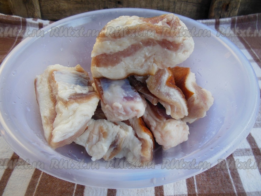 По правилам сало никогда не промывают в воде, а лишь соскребают ножом. Я отхожу от этого принципа и всегда промываю, а затем просушиваю с помощью бумажного полотенца. Места, которые на вид не нравятся, соскребаю ножом. Подготовленное сало нарежьте на небольшие кусочки.