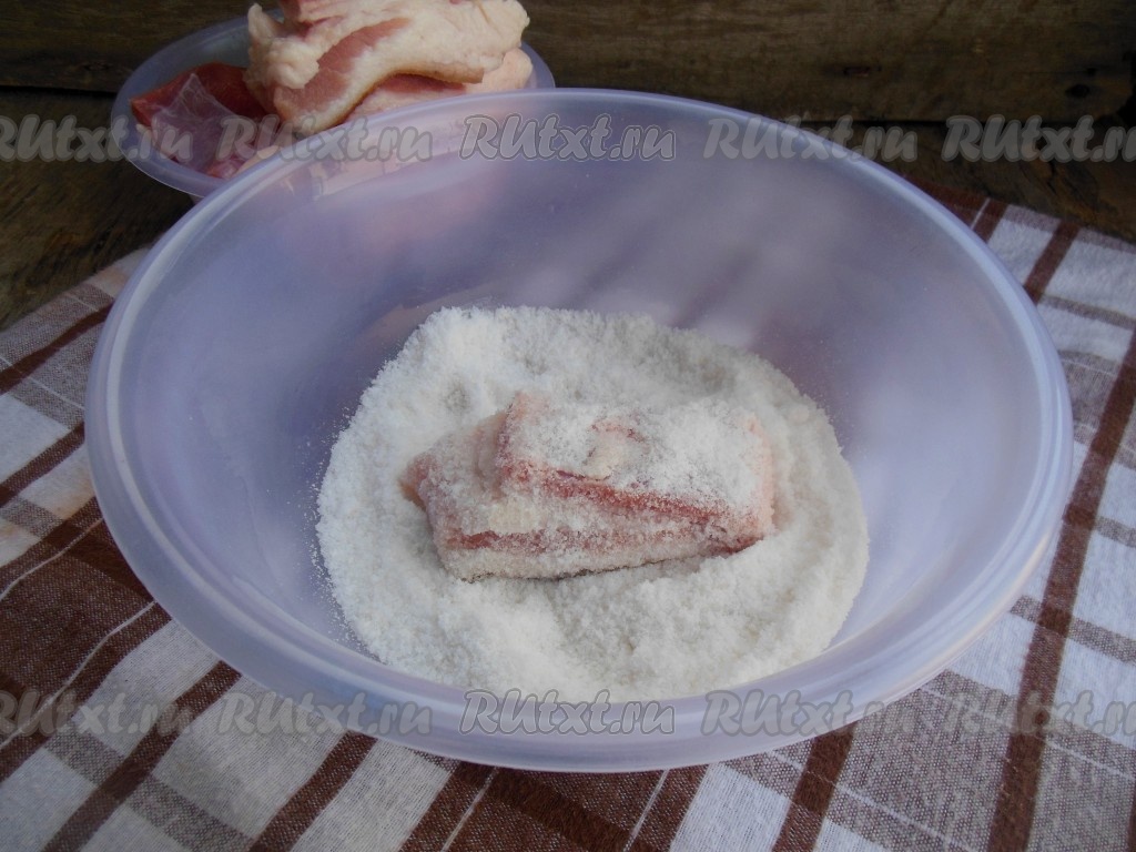 В миску насыпьте соль и обваляйте каждый кусочек сала в соли.