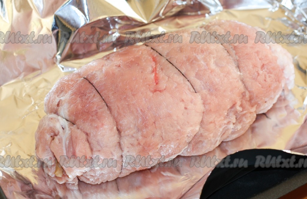 Мясо свернуть в рулет, края завернуть внутрь, перевязать кулинарной нитью или шпагатом. Выложить на противень, застеленный фольгой, накрыть рулет краями фольги и запекать в разогретой духовке при температуре 180-200 градусов до готовности (минут 30-35). Перед самым концом запекания края фольги раскрыть, чтобы рулет покрылся золотистой корочкой. Готовность рулета определяют проколом деревянной шпажки, в месте прокола должен вытекать прозрачный сок.