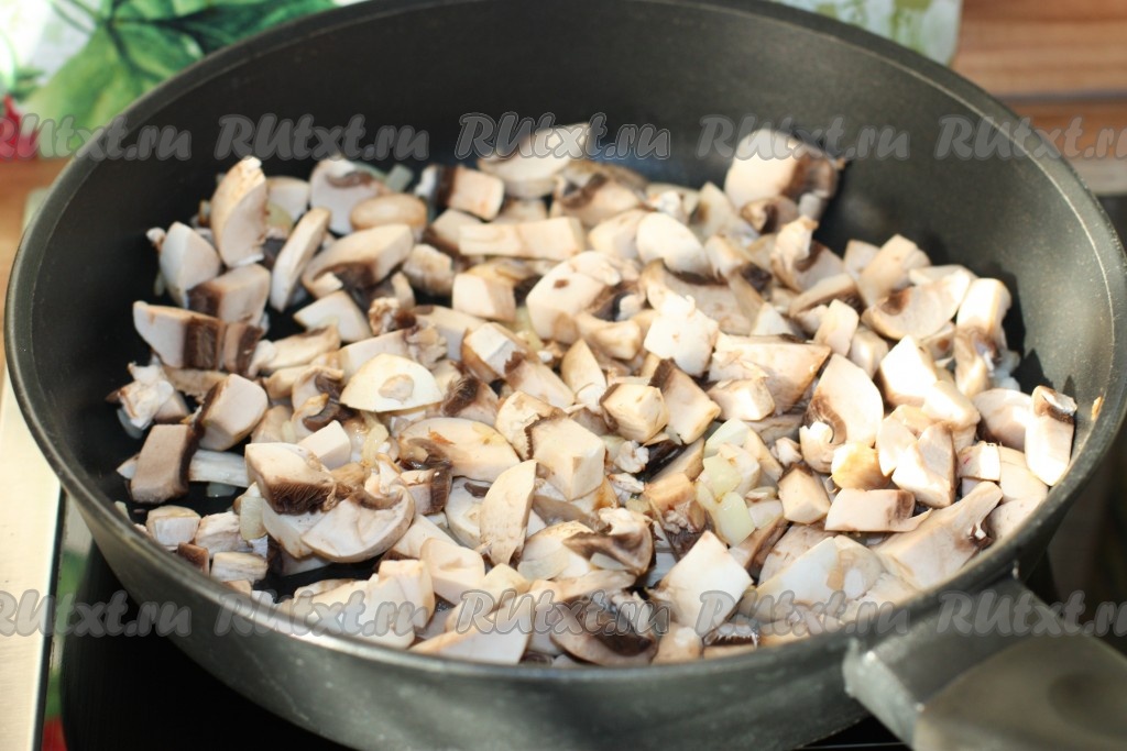 Шампиньоны нарезать средними кубиками, добавить к луку и обжарить на небольшом огне, помешивая, до готовности (в течение 5-7 минут), посолить, поперчить.