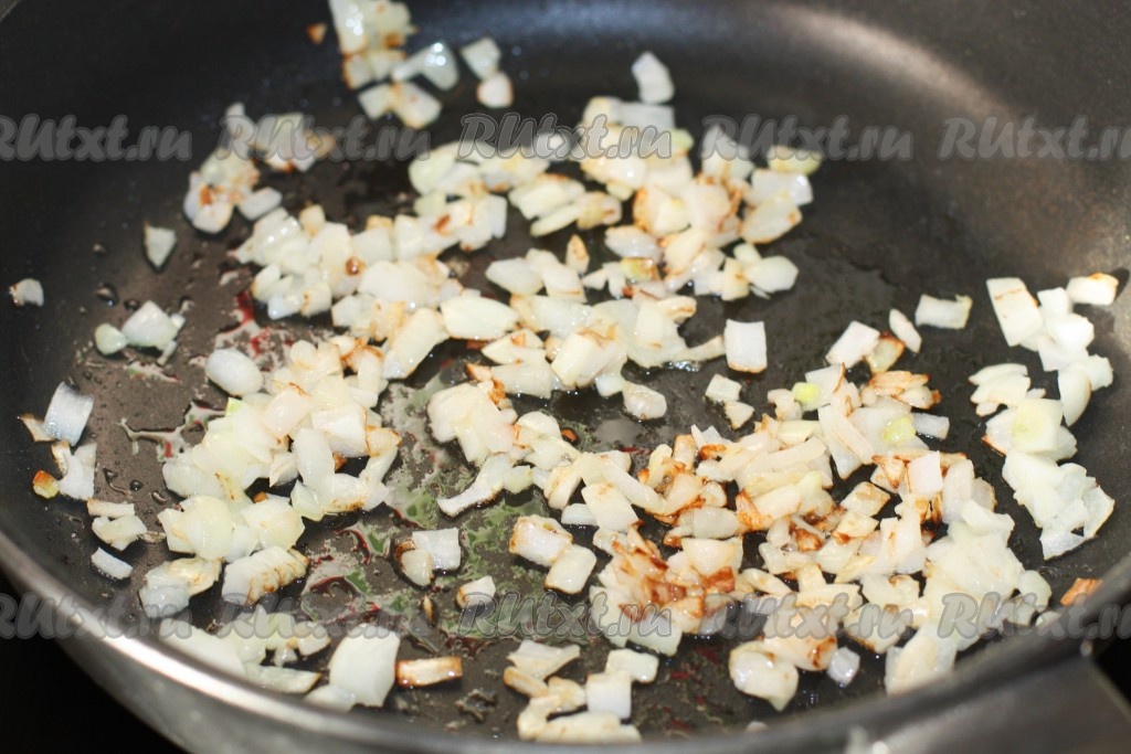 Лук очистить, нарезать мелкими кубиками, обжарить на растительном масле до золотистого цвета.