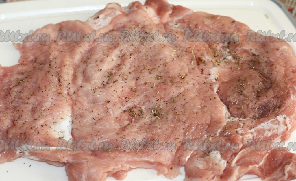 Кусок свинины с обеих сторон натереть солью, молотым чёрным перцем, посыпать приправой.