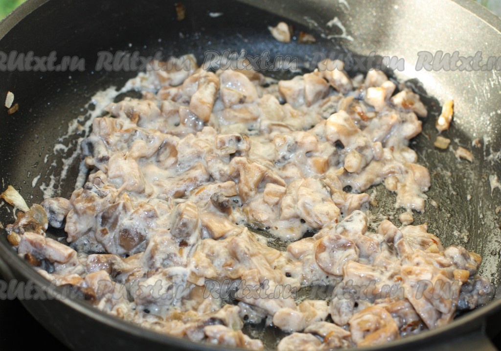В обжаренные лук и грибы добавить муку, перемешать, затем добавить сметану, протушить 2-3 минуты, посолить, поперчить и убрать с огня.