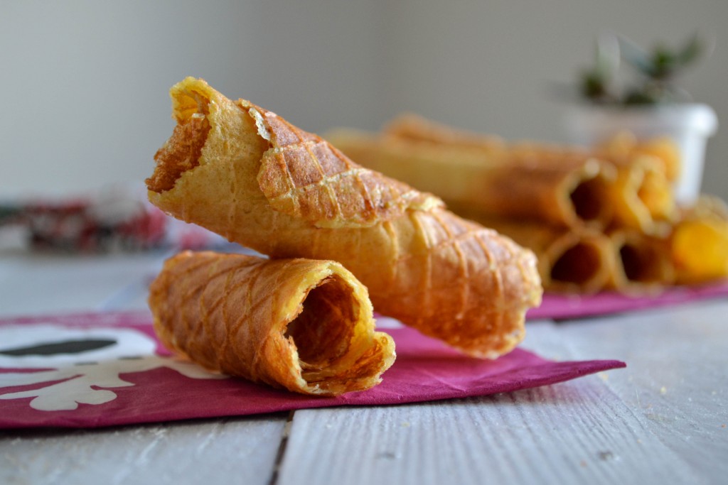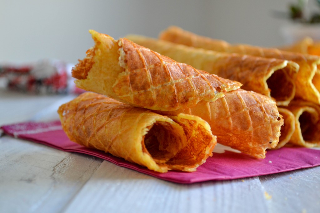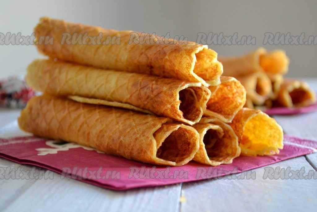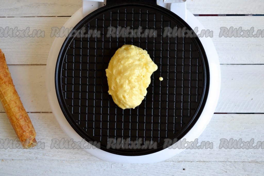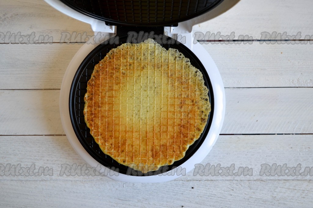 Готовую творожную вафлю сразу же, не снимая с электровафельницы, скрутить трубочкой или конусом.