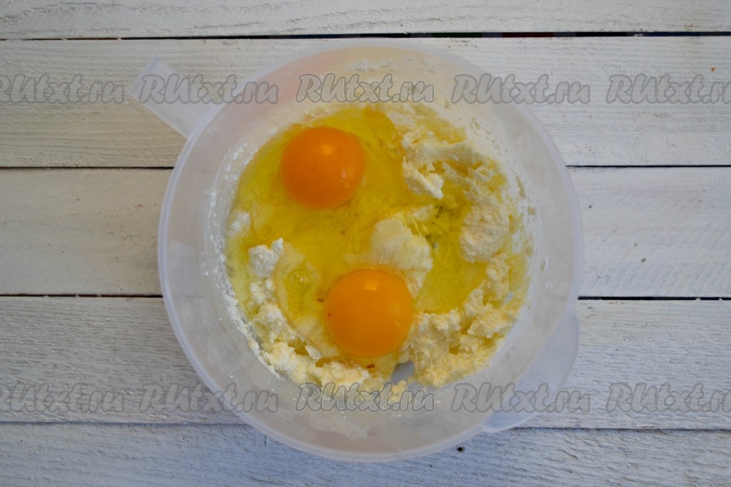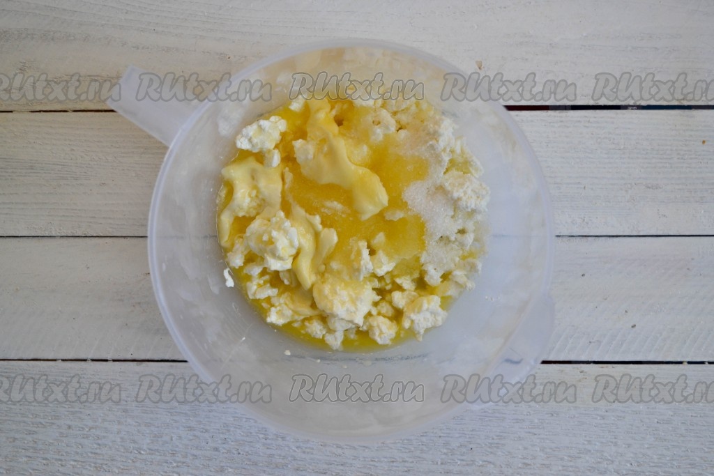 В глубокую миску выложить творог, размягченное сливочное масло и всыпать сахар, тщательно растереть вилкой или блендером.