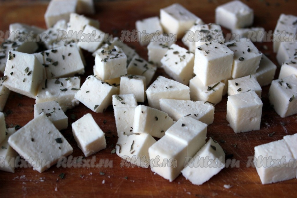 Адыгейский сыр нарезать кубиками и посыпать сухим базиликом.
