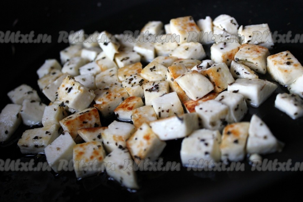 Слегка обжарить кусочки адыгейского сыра на растительном (оливковом или другом) масле.