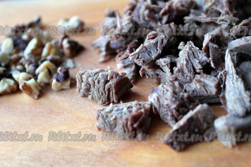 Мясо нарезать на кусочки, грецкие орехи порубить.