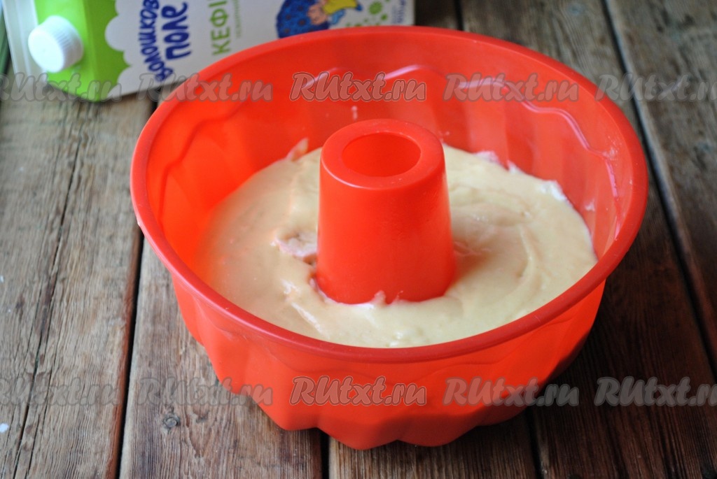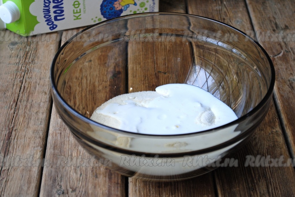 Кефир должен быть комнатной температуры. Его можно достать заранее из холодильника, чтобы он согрелся, либо подогреть в микроволновке в течение секунд 20. Манную крупу насыпать в объёмную миску, залить кефиром комнатной температуры.