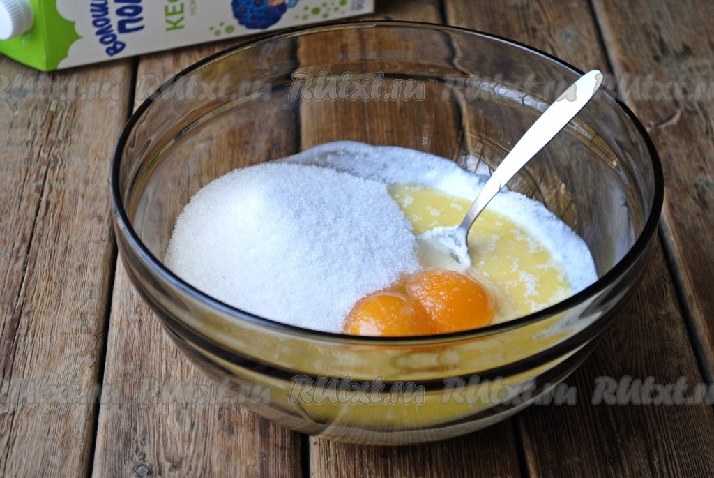 Затем в набухшую манку вбить яйца, добавить сахар и растопленное не горячее сливочное масло.