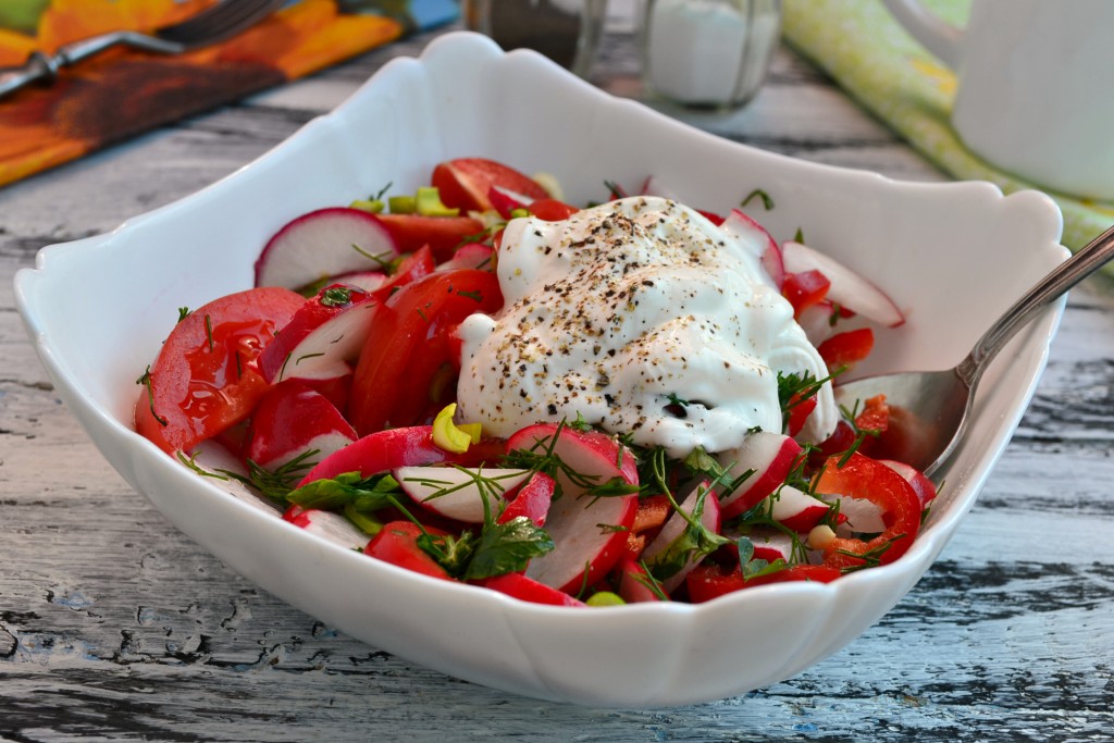 Простой и очень вкусный салат с редиской и помидорами можно быстро приготовить и подать в качестве дополнения к основным блюдам. Заправить салатик можно сметаной или майонезом, нам больше по душе сметана. Зелень можете добавлять по своему вкусу.