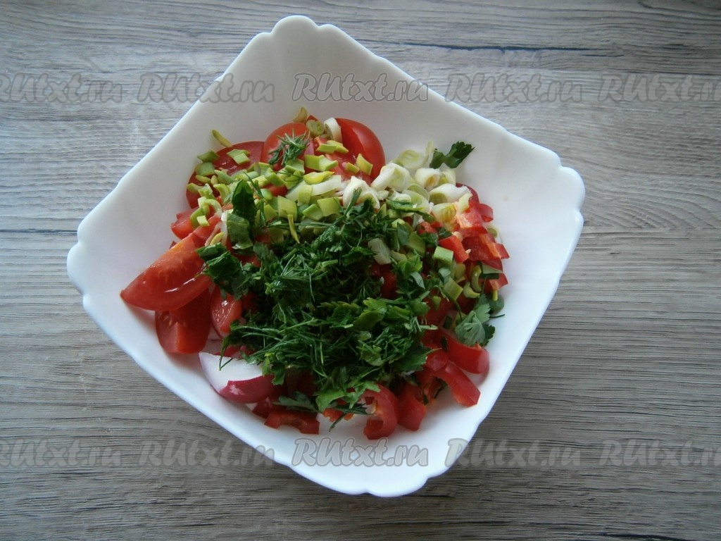 Всю зелень измельчить и добавить в салат.