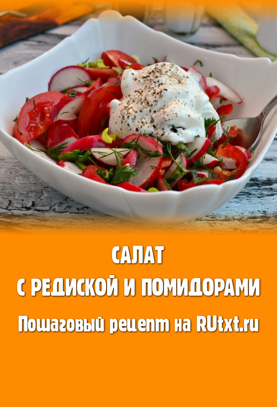 Овощи с зеленью немного перемешать. Салат солить, перчить и заправлять сметаной следует непосредственно перед подачей. Вкусный, сочный салат, приготовленный с редиской и помидорами, подать к столу.