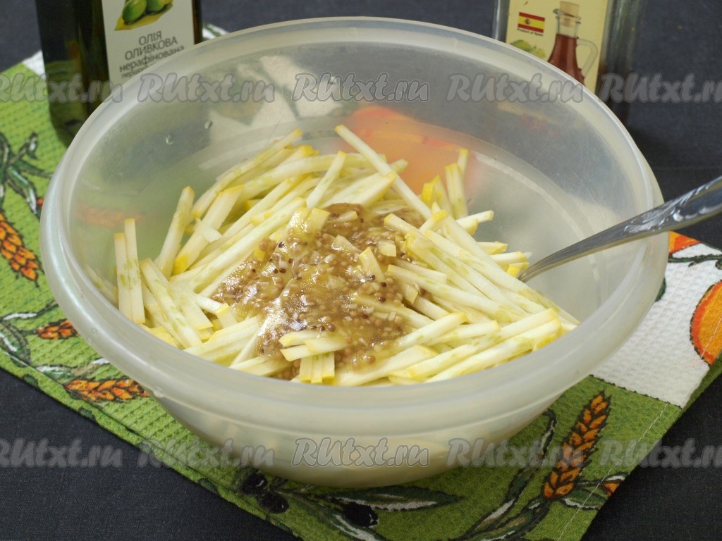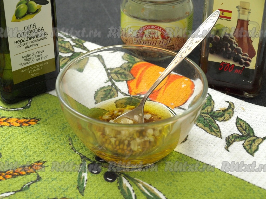 Для приготовления заправки смешать масло, винный (или яблочный) уксус, французскую горчицу и нарезанный чеснок.