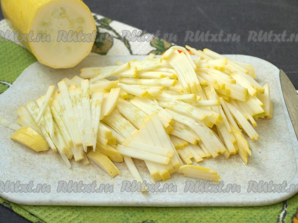 Кабачок вымыть и нарезать тонкой соломкой. Молодой кабачок чистить от кожуры не нужно.