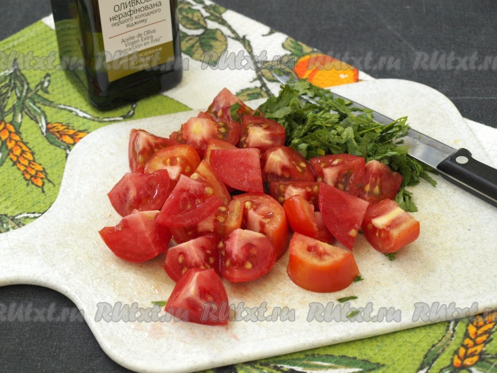 Крупными кусочками нарезать помидоры и измельчить петрушку.