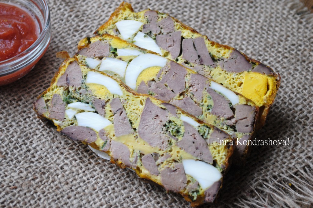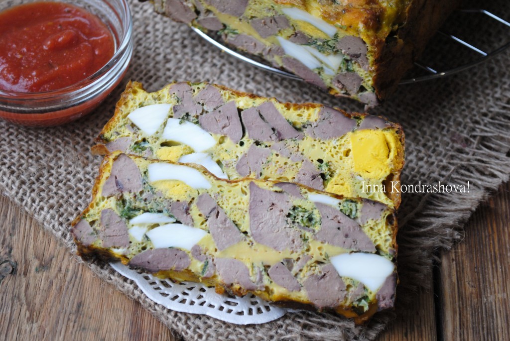 Затем нарезать дроб из куриной печени и яиц на порционные кусочки и можно подавать на стол, очень вкусно кушать его с томатным или сметанным соусом. Посмотрите, каким красивым в разрезе получается это простое и доступное блюдо.
