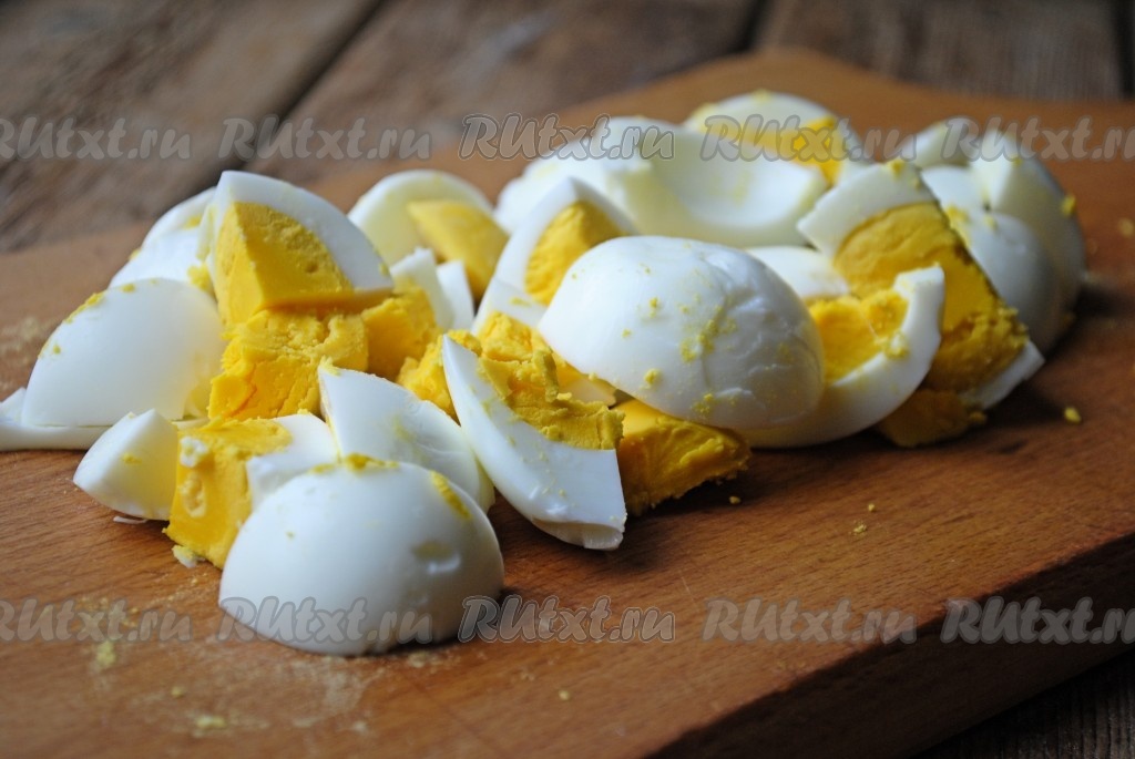 4 яйца залить водой и отварить вкрутую на среднем огне (в течение 9-10 минут с момента закипания). Затем остудить, очистить и нарезать крупными кусочками произвольного размера.
