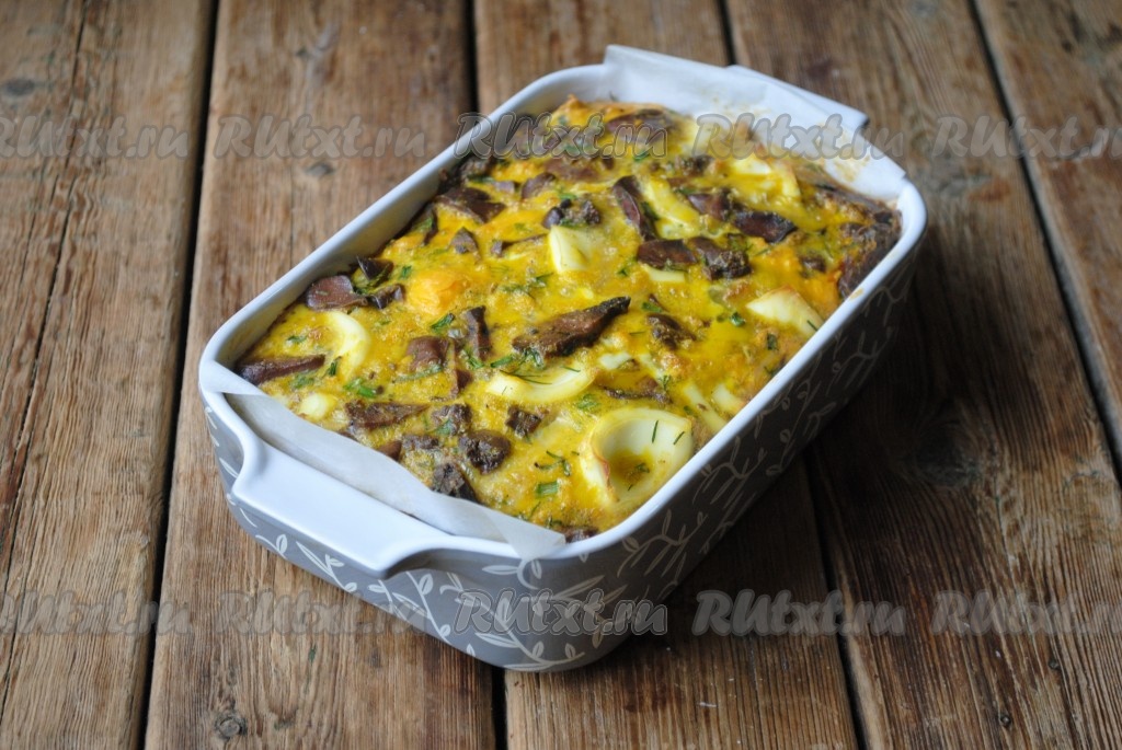 Запекать дроб из куриной печени и яиц в разогретой до 180 градусов духовке 40-45 минут (до готовности). Блюдо будет считаться готовым, когда на его поверхности не будет мокрых участков яичной заливки.