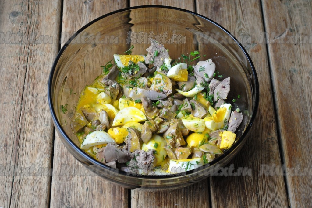 Печень, яйца и зелень соединить в миске, посолить и поперчить по вкусу, перемешать.